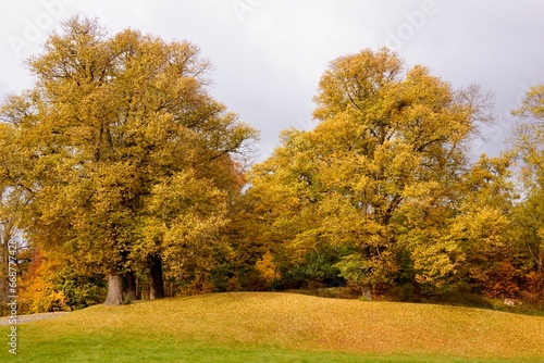autumn, autumn color, awe, bush, color image, day, deciduous tree, glade, grass, horizontal, lawn, leaf, many-coloured, nature, no people, old, orange color, outdoors, photo, public park, red, season, stockholm, sweden, tree, variation, yellow
