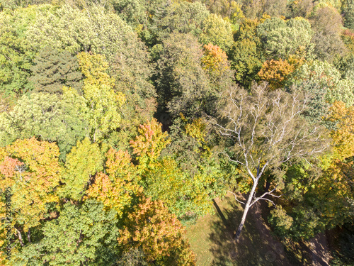 park natural landscape scene in autumn. aerial top view of trees with yellow and green foliage