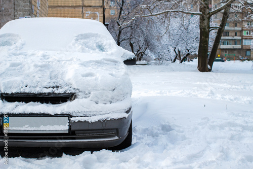 Parked car covered with snow - snow storm, car after a heavy snowfall, a lot of snow on the car, car in the snowy yard, front view