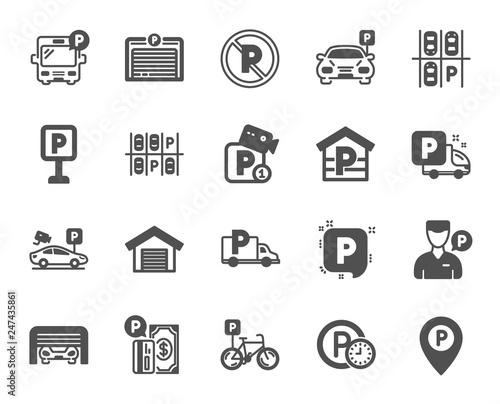 Parking icons. Car garage, Valet servant and Paid transport parking icons. Video monitoring, Bike or Car park and Truck or Bus transport garage. Money payment, Map pointer and Free park. Vector