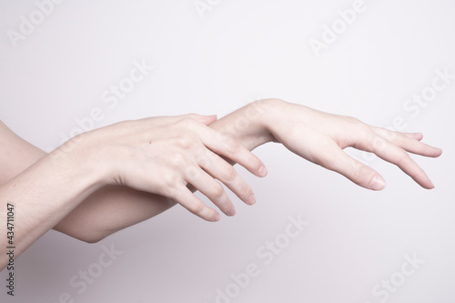 Parkinson's disease symptoms. Close up of tremor (shaking) hands of Middle-aged women patient with Parkinson's disease. Mental health and neurological disorders.