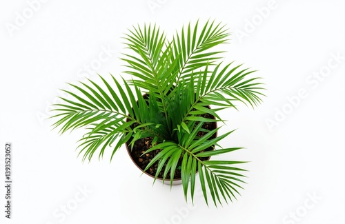 Parlour palm Chamaedorea Elegans houseplant top view isolated on white background. Green leaves home decor. Indoor botanical, popular home decoration element, plant in pot. Home gardening, air