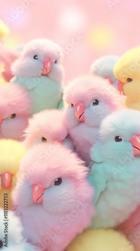 animal, bird, cute, aesthetic, wallpaper, parrot, light, three-dimensional, toy, colours, balloon, cartoon, pink, illustration, celebration, background, easter, nature, pastel, yellow, fluffy, group, softness, closeup, poultry, dreamy, mammal, representation, rodent, plush, beak, fowl, pastel colour, many-coloured