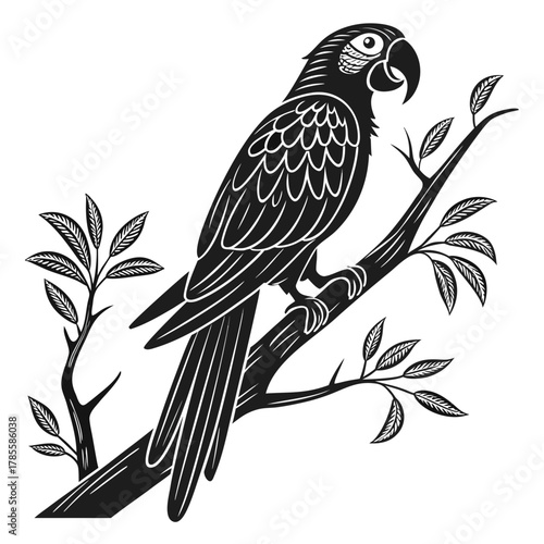parrot, tree branch, bird, perch, tropical bird, illustration, art, graphic, drawing, nature, exotic, tropical, wildlife, avian, feather, beak, eye, detailed, pattern, leaf, flora, tree, environment, animal, beauty, elegant, simple, design, element, icon, symbol, shape, decorative, creative, artistic, monochrome, black, white, isolated, clean