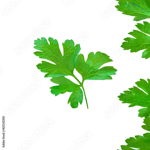 Parsley isolated on white background. Fresh Parsley leaves closeup. Package design elements Flat lay. Top view..