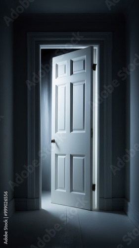 open door, mystery, doorway, shadow, suspense, contrast, unknown, anticipation, glow, interior, minimalist, eerie, entrance, passage, transition, secret, solitude, quiet, exit, entranceway, home interior, door frame, hallway