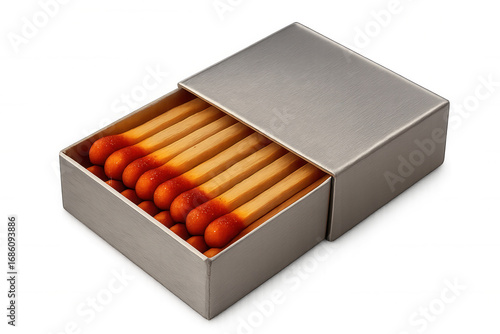 matchbox, match, open, wood, red, phosphor, fire, flammable, light, lighting, ignition, heat, burn, burning, danger, safety, survival, camping, fireplace, balefire, emergency, tool, equipment, household, object, still life, studio shot, closeup, detail, isolated, no people, matchstick, box, container, metal, silver, idled, new, full, ready, potential, energy, power, spark, flames, risk