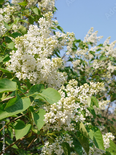 Partly blossoming bush of white lilac pleases the eye. Spring is the most beautiful time