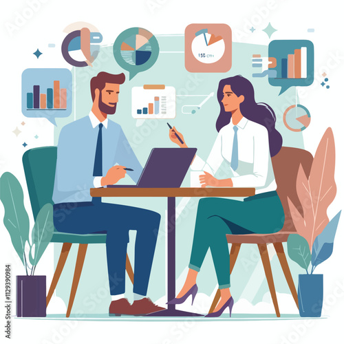 Partners meeting for business discussion with documents and laptop on desk. Couple at round table, speaking, discussing work, partnership. Flat vector on a white background