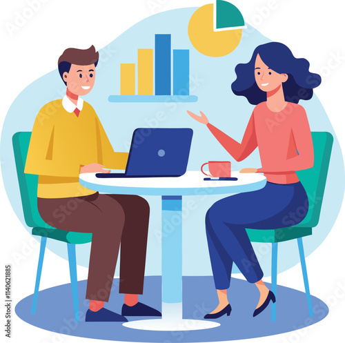 Partners meeting for business discussion with documents and laptop on desk. Couple at round table, speaking, discussing work, partnership. Flat vector on a white background