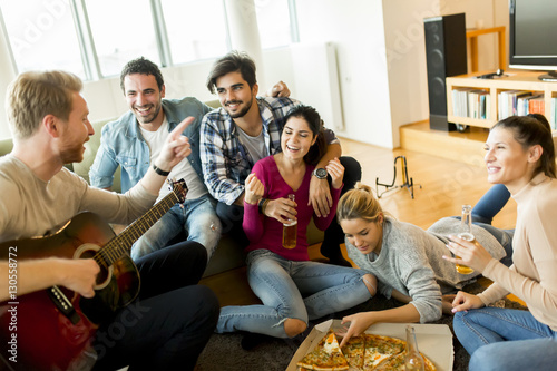 apartment, celebration, cheerful, drink, eating, food, friends, friendship, fun, group, guitar, happy, ravenous, indoor, leisure, lifestyle, man, music, party, people, pizza, positive, smiling, student, together, woman, young, cider