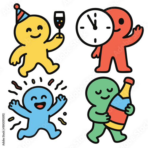 party, celebration, character, clock, bottle, champaign, festive, cheerful, smiling, colourful, cartoon, mascot, holiday, countdown, toast, dancing, hat, confetti, joyful, happiness, friends, together, fun, event, drink, beverage, glasses, playful, cute, simple, flat, illustration, outline, people, human, adult, green, yellow, blue, red, accessory, midnight, festival, surprise, excited
