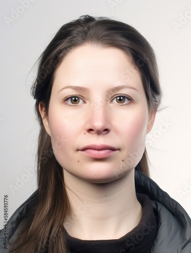 ai, woman, biometric, id, passport, id, neuter, countenance, face, person, people, closeup, photogenic, portrait, eye, expression, looking, hair, head, close, business, stern