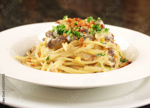 pasta, spaghetti, food, italian, meal, sauce, plate, dinner, cookery, dish, lunch, tomatoes, carbonara, cheese, noodle, white, epicure, delicious, healthy, seafood, cooking, parmesan, shrimp, eatery, basil