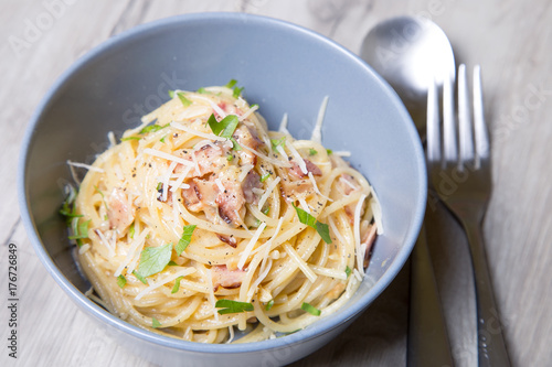 Pasta carbonara with bacon, cheese and parsley. Traditional Italian dish. Close-up, selective focus.