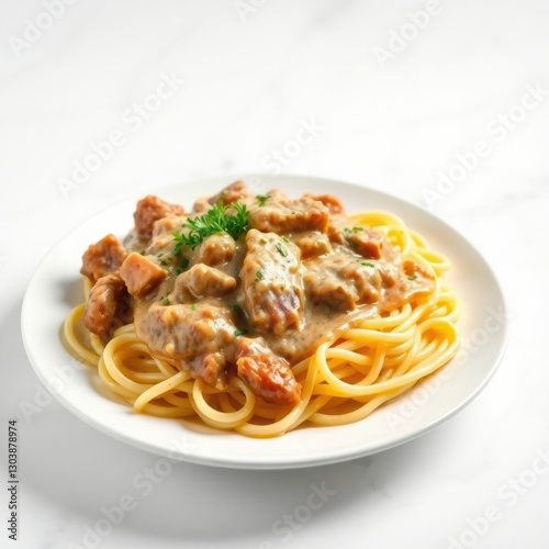 Pasta dish featuring spaghetti topped with creamy meat sauce and a garnish of fresh parsley on a white plate.