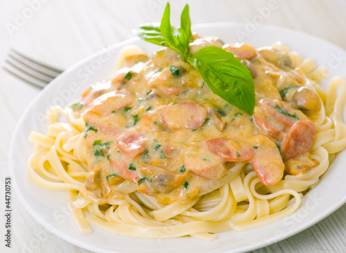 Pasta with mushrooms, smoked sausage and cream sauce with basil