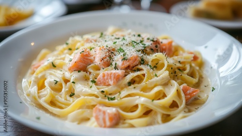 pasta with salmon in a creamy sauce sprinkled with parmesan cheese