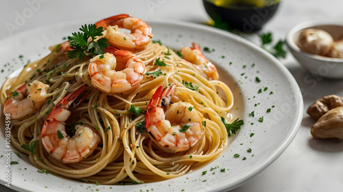 pasta, spaghetti, food, meal, italian, dish, plate, sauce, dinner, cookery, tomatoes, lunch, white, noodle, seafood, epicure, shrimp, delicious, healthy, cheese, basil, vegetable, linguine, eatery, noodle