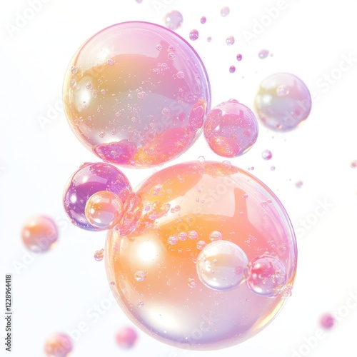 Pastel bubbles floating, studio shot, white background, cosmetic ad