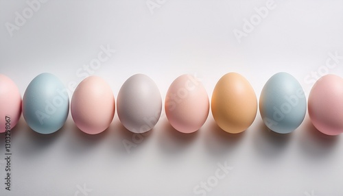 pastel colored eggs line a white surface forming an even row with one egg placed centrally