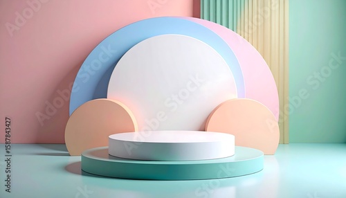pastel, geometric, shape, dais, white, circle, round, abstract, scene, three-dimensional, display, minimalist, modern, empty, blank, background, studio, light, soft, colours, peach, pink, light blue, turquoise, beige, cream, decorative, product, presentation, empty space, arrangement, composition, design, surface, interior, clean, simple, illustration, art, wallpaper, image, template