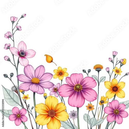 Pastel colored spring flowers and leaves sketched on a light background, delicate, drawing, bright