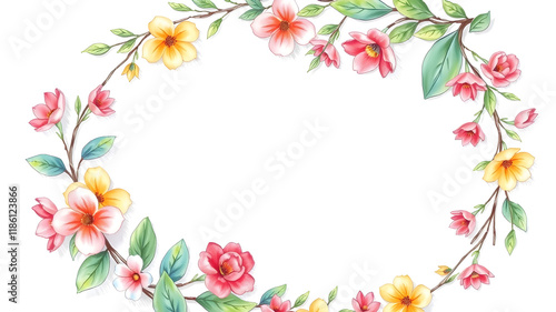 Pastel drawing artistic image of floral wreath as a frame for round white space. some leaves or flowers may overlap that white background. it has to be colorful, look natural. Generative AI