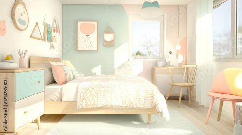 bedchamber, girl, pastel, interior, design, decor, room, furniture, bed, light, colours, cute, cosy, modern, minimalist, children, children, home, sweet, house, space, style, aesthetic, artistic, decoration, art, calm, serene, peaceful, sunny, bright, happy, cheerful, playful, whimsical, dreamy, wooden, table, chair, window