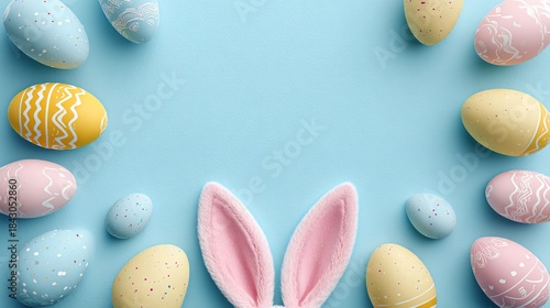 easter, egg, rabbit, spring, holiday, celebration, pastel, blue, pink, yellow, decoration, festive, tradition, religion, hunt, gift, colourful, background, topview, minimal, copy space, frame, border, seasonal, greeting, invitation, card, vertical, horizontal, art, design, texture, bright, cheerful, joy, fun, childhood, event, symbol, rebirth, new life, april, march, season, ornament, painted, spiritual