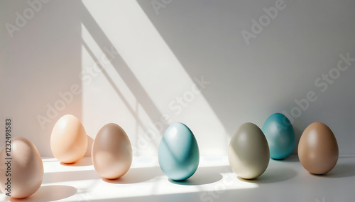easter, egg, pastel, blue, pink, beige, minimal, spring, holiday, celebration, tradition, decoration, colourful, natural, light, shadow, white, background, simple, copy space