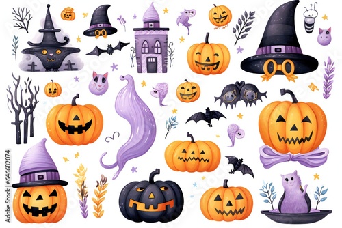 halloween, pumpkin, set, bat, ghost, icon, illustration, holiday, sorcerer, cartoon, cat, autumn, horror, skittish, monster, hat, design, spider, black, scarey, october, symbol, silhouette, celebration, generative, ai