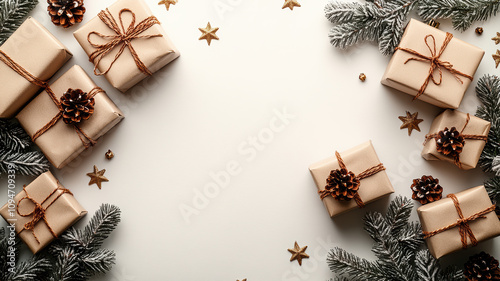 Pastel holiday border with gifts and snowflakes in cartoon style