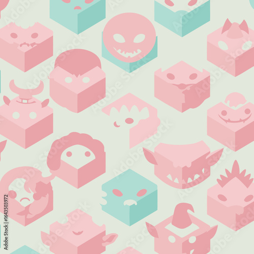 Pastel pink and mint green isometric monster icons in a seamless pattern. Cute, stylized creatures in various poses within the geometric background. No specific demographic.