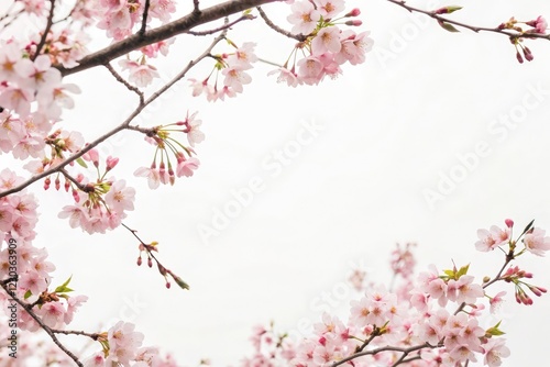 Pastel pink cherry blossom branches surround a minimalist white background, pastel pink flowers, floral frame