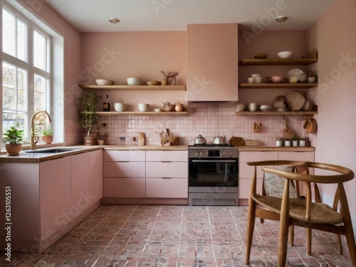 kitchen, pink, pastel, wooden, shelf, tile, floor, cabinet, countertop, sink, faucet, oven, stove, range, cookware, dish, bowl, utensil, plant, greenery, light, airy, minimalist, modern, farmhouse, rustic, cosy, warm, home, decor, design, style, chair, seating, natural, bright, room, space, homelike, comfortable