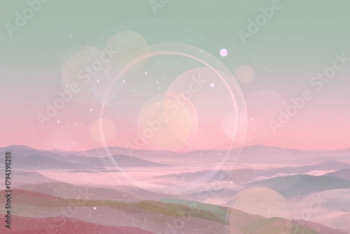 sunrise, sunset, mountain, mist, fog, pastel, pink, peach, green, light, bokeh, circle, soft, dreamy, aethereal, serene, calm, peaceful, tranquil, romantic, magical, mystical, landscape, scenery, nature, beauty, art, digital, illustration, graphic, design, abstract, background, texture, vibrant, delicate, subtile, gentle, glowing, shimmer, sparkle, dust, star, hazy, colours, atmosphere