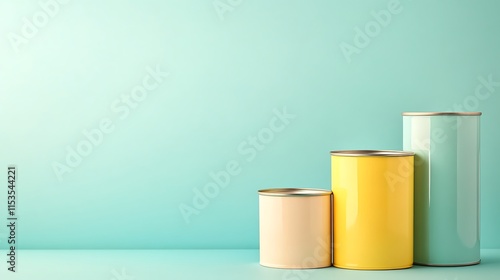 Pastel-Colored Cans Elegantly Arranged on a Soft Teal Background: Close-Up Product Photo Mockup. AI Generated