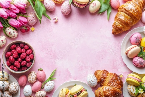 easter, pastel, treat, pastry, croissant, egg, tulip, flower, raspberry, berry, spring, sweet, dessert, brunch, breakfast, festive, food, deliciously, colourful, delicious, decorated, pretty, light, pink, background, frame, elevated, top, view, arrangement, tableware, plate, bowl, fresh, natural, artisan, bakery, homemade, holiday, celebration, springtime, delicate, elegant, sweet, beautiful, gift