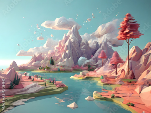 Pastel-colored low polygon landscape featuring clouds, water, and natural surroundings. Mountains backdrop with a sunset ambiance. 3D rendering illustration ideal as wallpaper or design background
