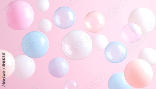 Pastel-colored spheres, floating in mid-air against a soft pink background