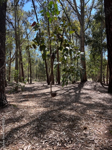 path in the woods in a uruguaian park. Parque natural uruguayo con árboles, pinos y eucaliptos