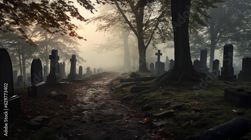 Path Through Forest Graveyard in the Fog, Misty Creepy Cemetery with Gravestones