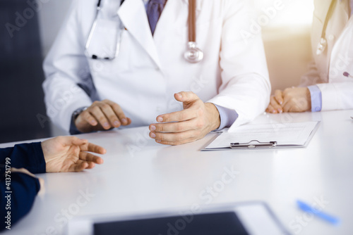 Patient woman and two doctors are discussing something while sitting at the desk in modern clinic. Perfect medical service, medicine concept