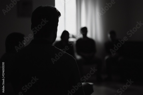 therapy, group, support, mental, health, psychology, counseling, patient, healer, addiction, depression, anxiety, stress, problem, solution, help, treatment, listening, speaking, communication, dark, silhouette, shadow, monochrome, black, white, meeting, discussion, health care, psychiatrist, rehab, community, togetherness, hope