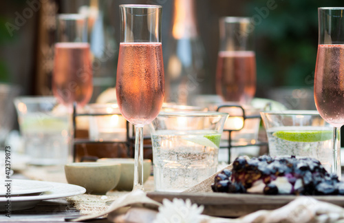 champaign, new year's eve, celebration, blueberry, candle, wine, brie, terrace, blueberry, table, summer, air, sparkling, setting, set, pink, patio, party, outside, outdoors, night, new year, meal, jam, hors d'oeuvre, glasses, garden, food, flute, evening, dinner, candlelit, dining, dessert, compote, candlelight, cheese, table setting