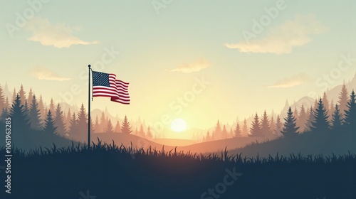 memorial day, memory, american flag, sunrise, patriotism, serene, forest, morning, calmness, flag pole, scenic, picturesque, dawn, nature, peaceful, flag, sun ray, evergreen tree, beautiful, sunset, sky, sun, cloud, landscape, orange, cloud, blue, light, red, evening, colours, dusk