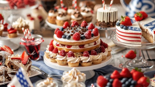 Patriotic-themed desserts and treats arranged on a table for Independence Day