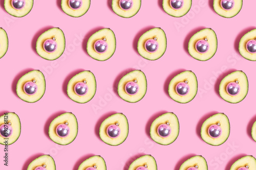 Pattern from green ripe avocado with a pink Christmas ball on a pink background. Creative concept of healthy food for New Year's table