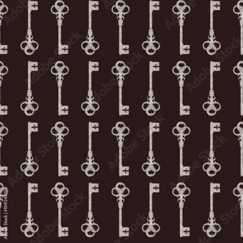 Pattern of vintage keys arranged against a dark background in a repetitive design